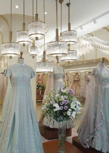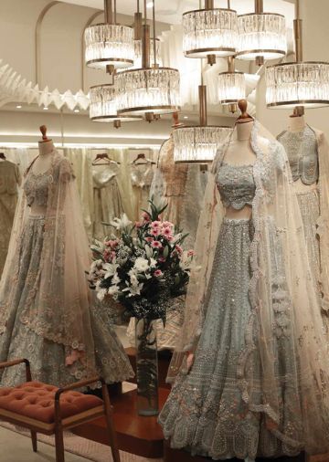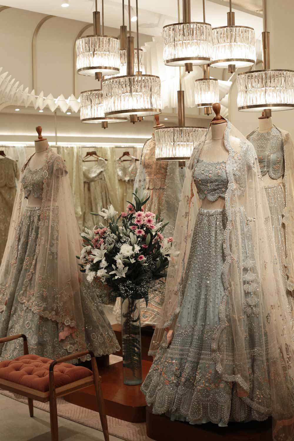 “My art interpretation is Japanese, and the work technique is Bengali,” says Adarsh. “As you know, Bengal is famous for its intricate work, such as zardozi and aari. And this is how I interpret Japanese art, in my creations.” One look around the store, and you can spot cherry blossoms and tactile blooms on powdery blue, dusty rose, and lemony yellow lehengas. This newest collection is called ‘Nishiki’ (a form of brocade gold weavingin Japan). Lehengas, saris, and anarkalis in tissue, kora and organza have been used with appliqué and traditional craftsmanship like aari-taari, zari, and knotwork. “The fabric I’ve used is gold weave handloom, with metalwork,” says Adarsh. “My summer launch for the bride had to be pastel, so the colours are appropriate for the season.”