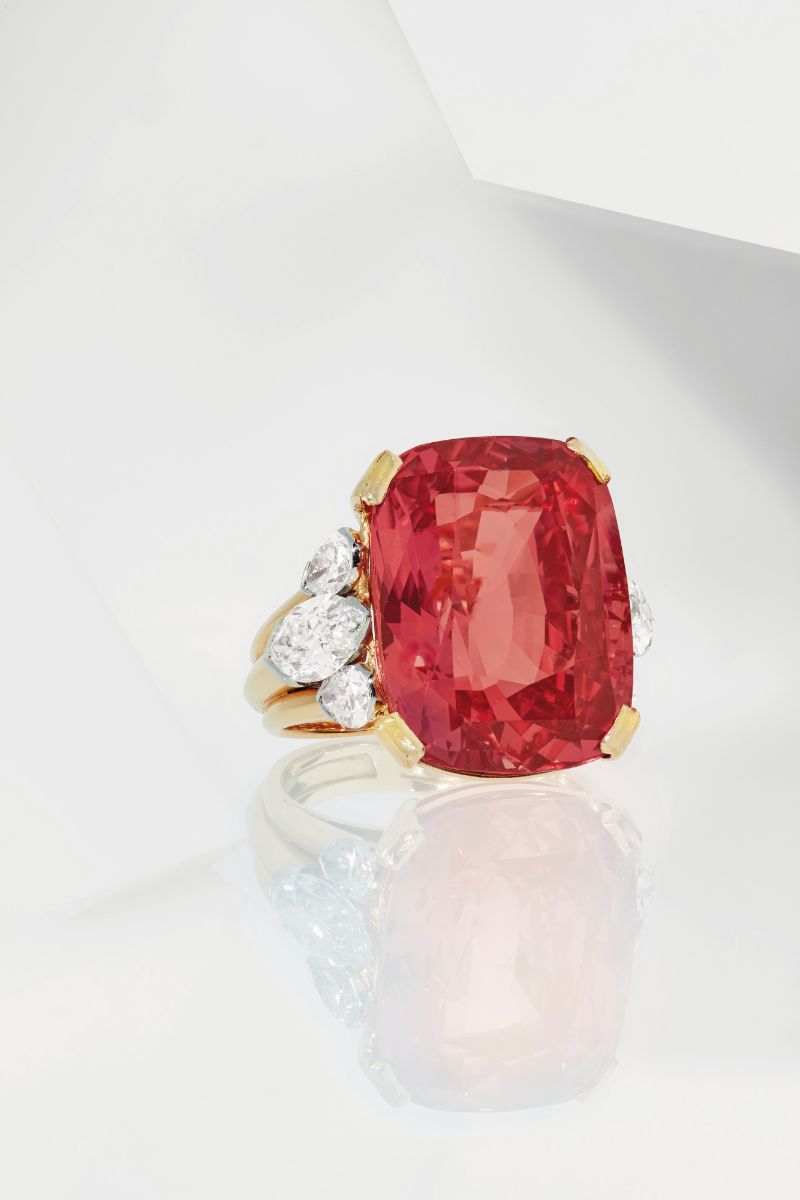 The Property from the du Pont Family Collection, which includes a ‘The du Pont Padparadscha’ sapphire ring weighing 24.58 carats ($500,000-700,000) and the ‘Sydney Queen’ black opal and diamond brooch and two unmounted black opals by Raymond Yard ($60,000-80,000).