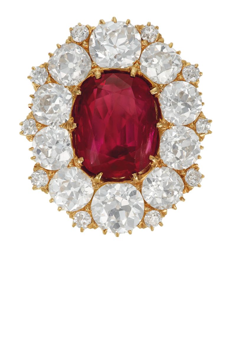 From the estate of MRS HENRY FORD II, ANTIQUE BURMESE RUBY AND DIAMOND BROOCH OF 8.62 CARATS
