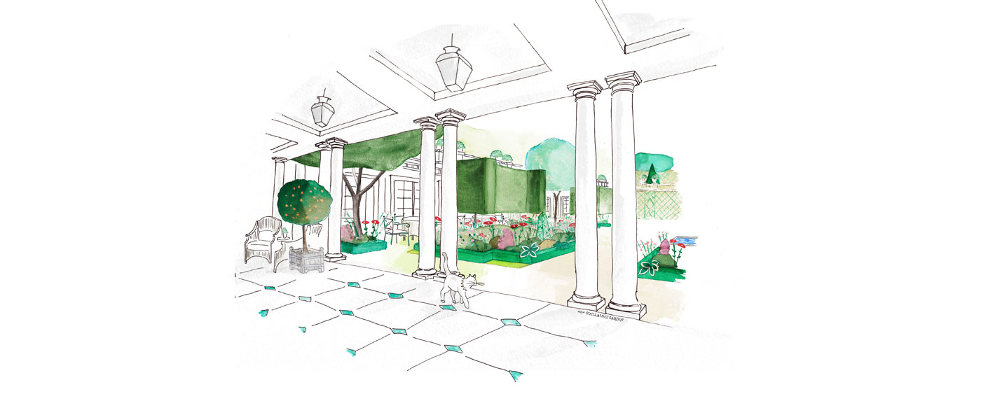 In keeping with France’s love story with gardens, it’s not surprising that Le Bristol Paris and Countess Bergit Douglas ofMM Design would choose a world renowned landscape designer Lady Arabella Lennox-Boyd, to recreate its own little slice of verdant heaven in the heart of Paris, only a few steps away from the bustle of Rue du Faubourg Saint-Honoré. Le Bristol Paris’ new garden is a hidden treasure, an oasis of flowers and calm, lined by plush drawing rooms and a colonnade adorned by blossoming orange trees.