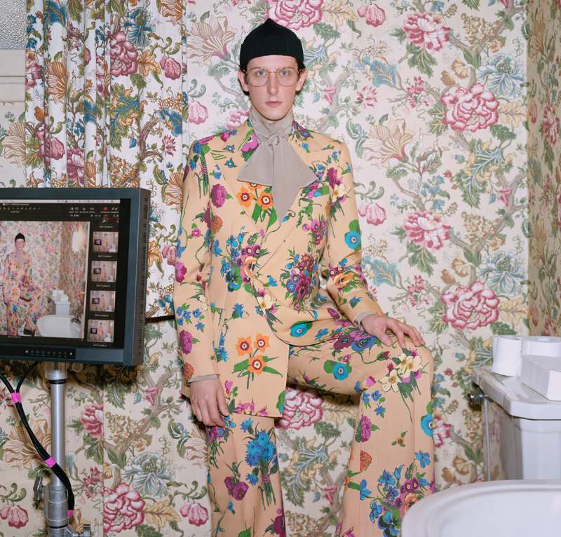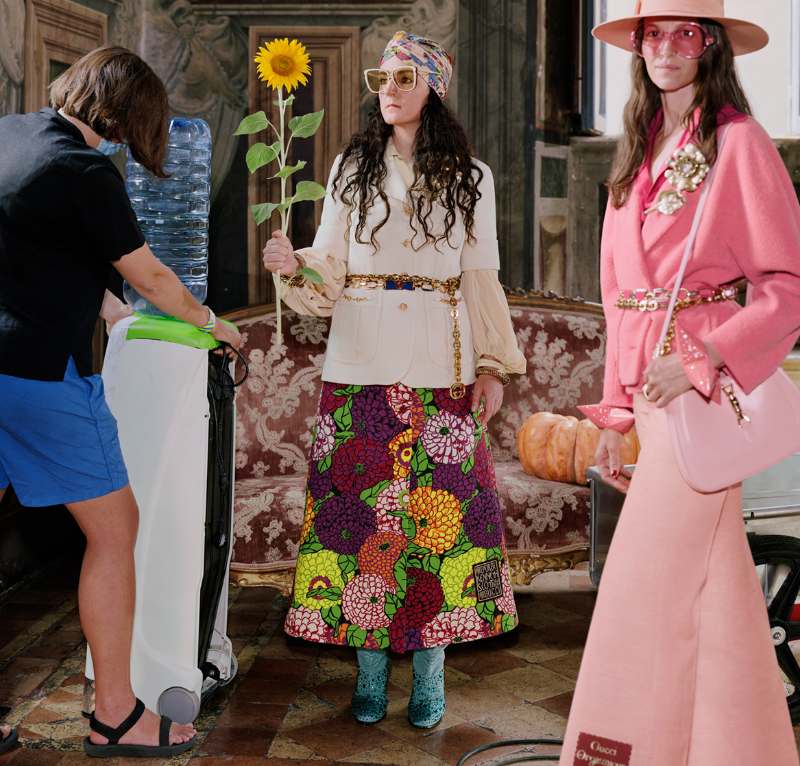 “I brought together different things, which represent the messy beauty that I have always sought: the chaos of beauty,” says Creative Director Alessandro Michele. “What happens to the relation between reality and fiction when prying eyes sneak into the mechanisms of the production of an image? What happens to fashion, when the true goes back to being just a moment of the false? Breaking the spell that forces my collaborators to passionately work on clothes they later have to abandon, I asked the team to wear them. And so we did a self-sufficient job, all inside our house, mixing things we had already done with things we were about to – overcoming the schemes of the time coherently with my idea of The Epilogue, the final resolution of a future that is largely present.”