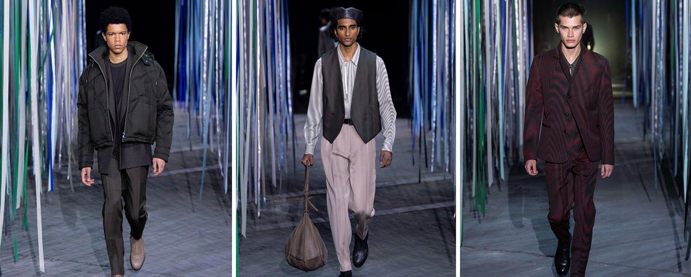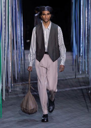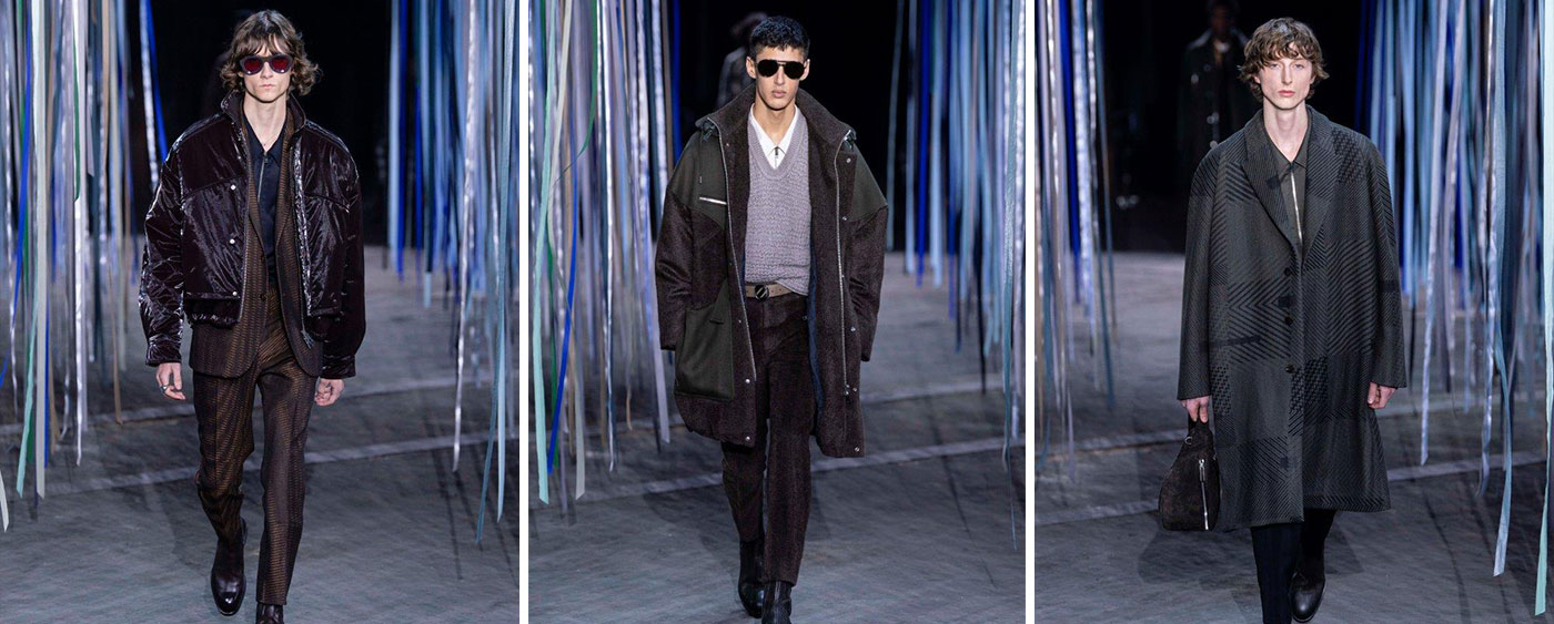 Under this geometric forest of ribbons, a redefinition of tailoring captures the spirit of the season, as the Zegna sartorial know-how is explored in new, hybrid directions. The silhouette is neat and layered; the sum of the parts and garments is accentuated; ergonomic details such as flaps and patch pockets add a utilitarian slant. Three-button suits with slightly boxy, one-breast-and-a-half jackets and tapered trousers are worn under puffy blousons; zip-up overshirts with low collar lines replace traditional shirting. The tailored waistcoat makes a comeback, as a passe- partout, with or without the suit. A process of constant morphing defines evolved shapes: wraparound, belted blazers; voluminous coats with deep back pleats; coat/parka fusions; shirts that double as short-sleeved blousons.