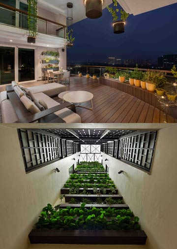 A new dimension is added to the basement by introducing a sunken courtyard, which is an extended garden and a source of light to the art gallery in the basement. The walls are decorated with planter beds to provide privacy to the space.