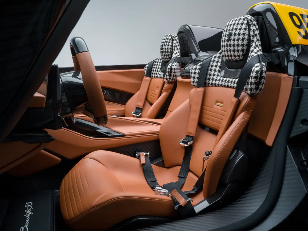 One of the most noticeable bespoke opportunities is the laser-engraved aluminium door plate, located on the outer edges of both doors and easily visible when entering and exiting the car. Finished in anodized black with bespoke B95 engraving in white, they add a sense of theatre to entering the hyper Barchetta.