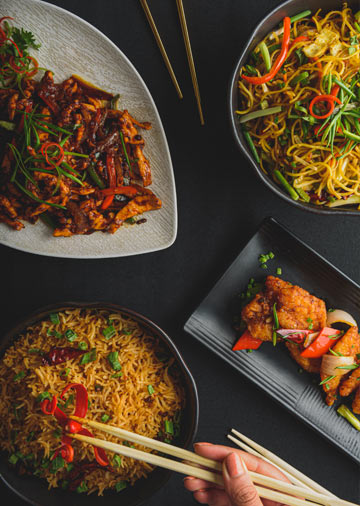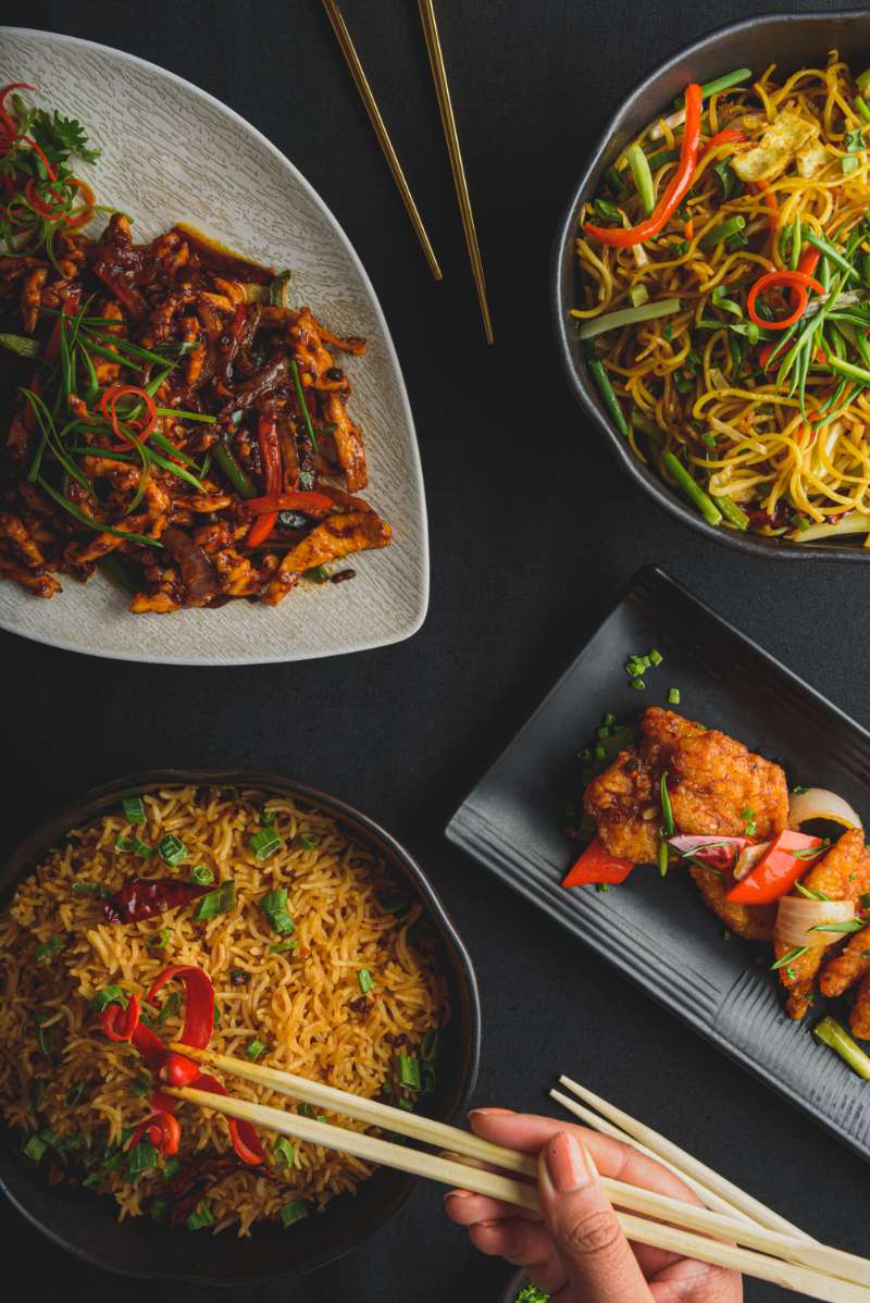 Pan Fried Fish, Fried Rice, Karate Chilli Chicken, and Hakka Noodles