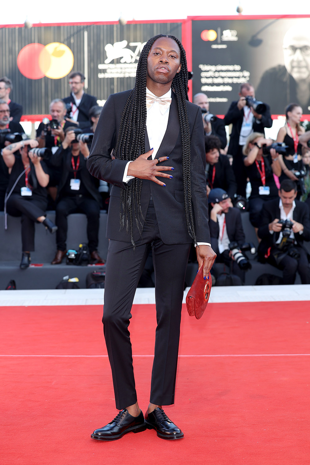 Jeremy O. Harris wore a Gucci black one button satin shawl lapel tuxedo with a white evening shirt, champagne satin bowtie, black leather lace-ups and a burgundy suede Gucci Blondie bag.