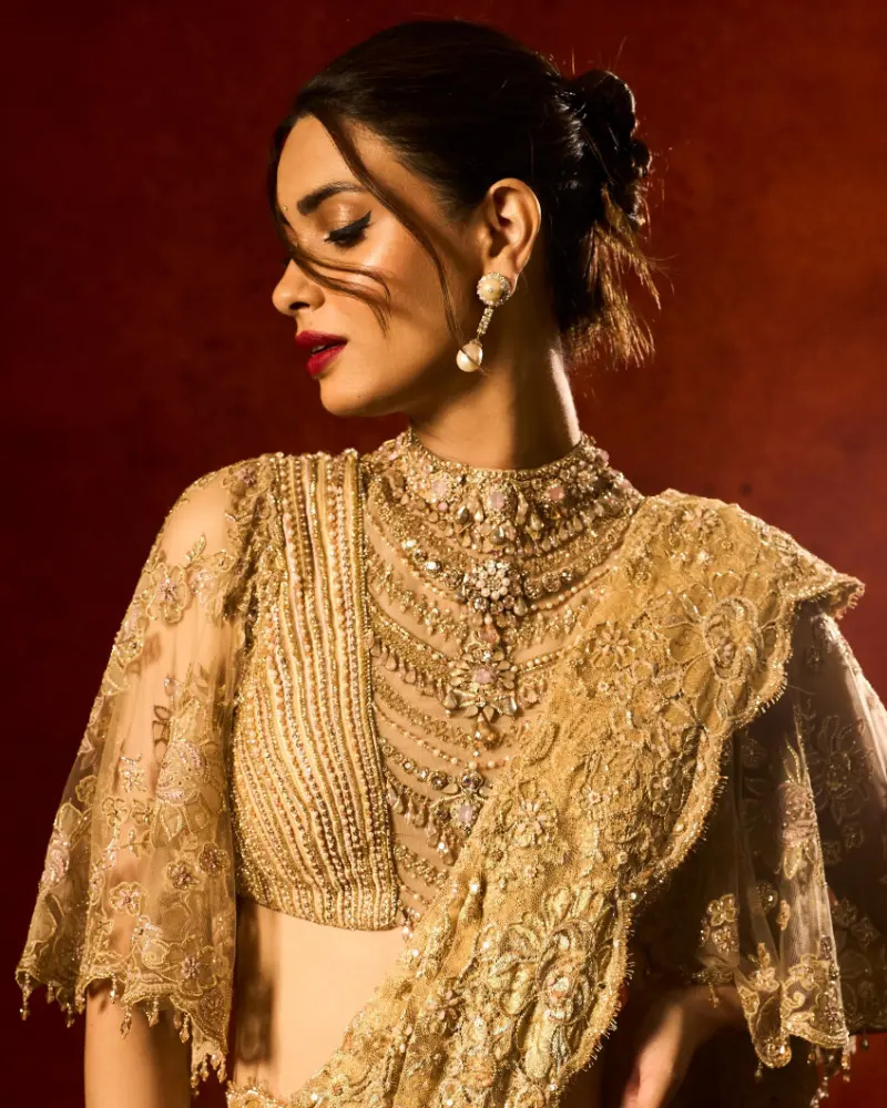 Diana Penty wore a French lace saree embellished with Japanese beads and sequins and studded with Swarovski crystals to add a touch of sparkle. Styled by Namita Alexander, the outfit was paired with a chic bell sleeve blouse to give it a glamorous, contemporary touch.
