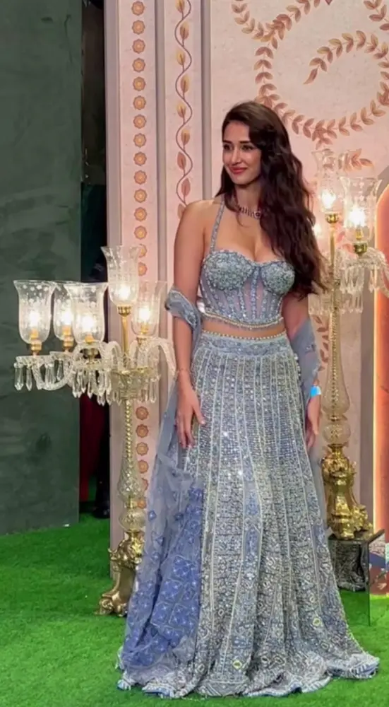 Disha Patani made a statement in an enchanting blue lehenga from Eeksha - by Ashwin Aggrawal from Kolkata at Radhika and Anant Ambani’s post-wedding festivities in Mumbai, styled by Devki Bhatt.