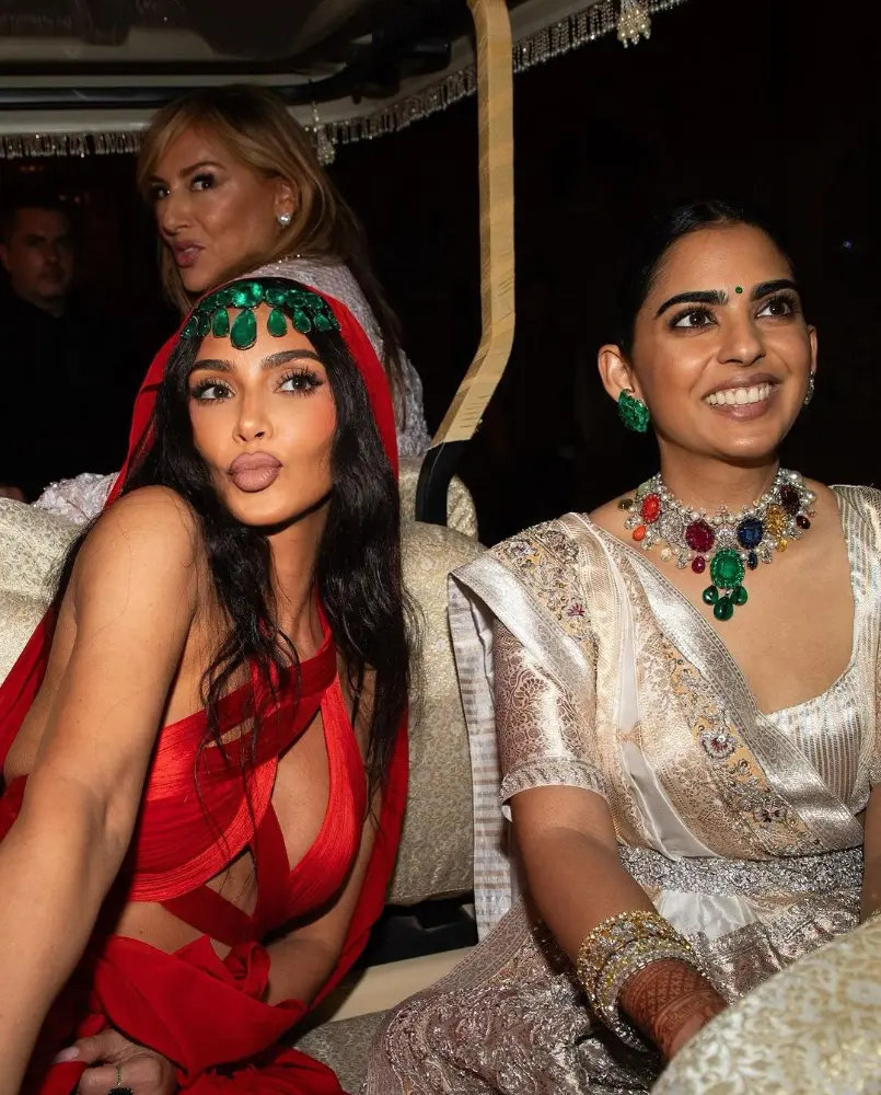 Kim Kardashian graced the post-Ambani wedding celebration in a breathtaking ensemble by Indian couturier Gaurav Gupta. She wore a flame orange chiffon draped serpentine top and skirt, which perfectly captured the essence of Gaurav Gupta's signature style. First showcased at Paris Couture Week SS24 in his Aarohanam collection, this look featured intricate sculpting techniques across the bustier and skirt, embodying a contemporary twist on the traditional saree with its infinite drape.