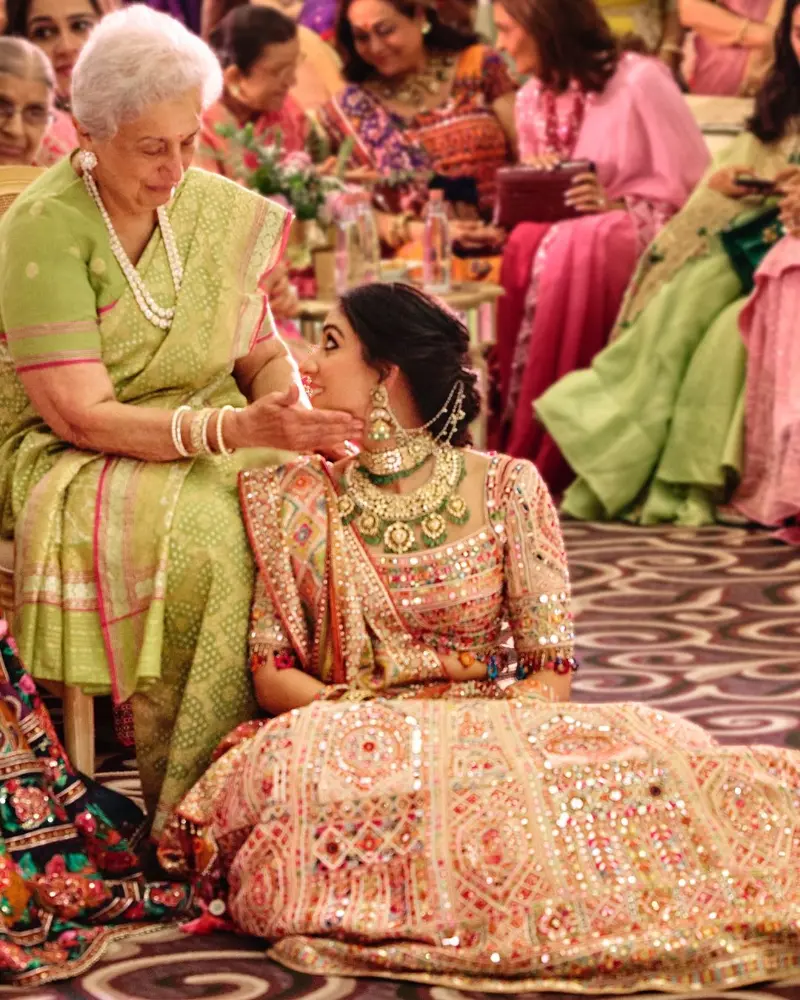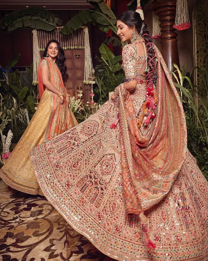 Radhika Merchant in Tarun Tahiliani, wears a Banjara and Kutchi inspired multi-coloured lehenga for her wedding festivities