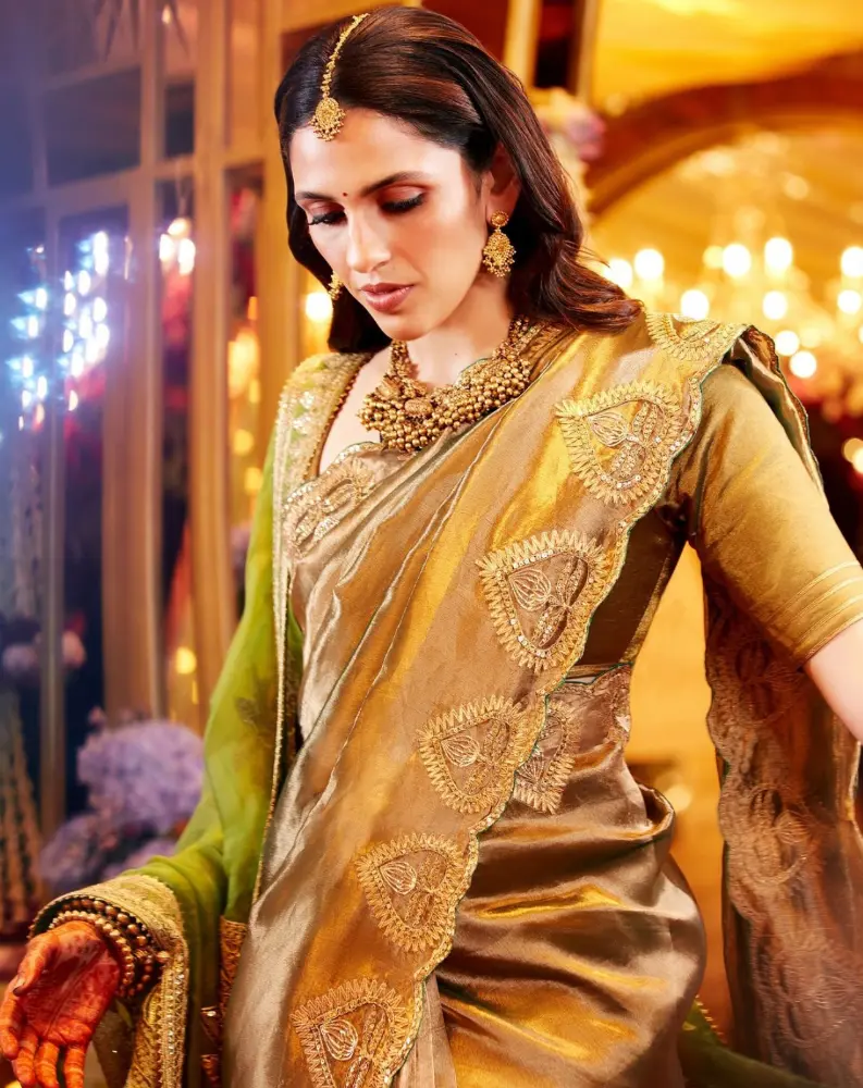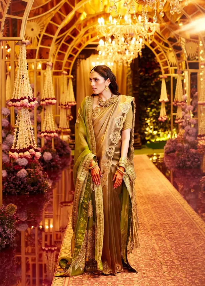 Shloka Ambani was dressed in the House of Masaba’s ‘Paan Tissue Saree’ at the recent Anant Ambani and Radhika Merchant’s wedding festivities. The green silk saree from ‘The Masaba Bride 2023’ collection adorns a house signature 'Paan-Patti' motif in pita and gota kaam and the blouse is in matching tissue with gota silai kaam. The saree was styled with a custom-made second dupatta with ‘Neel-Kamal’ embroidery all over in dori, sitara and moti kaam.