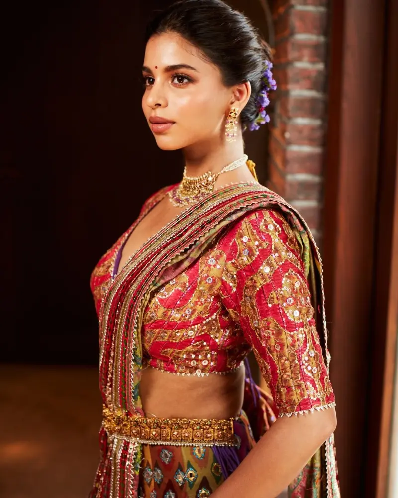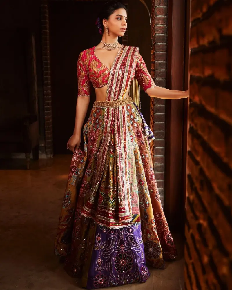 Suhana donned a multi-colour panel lehenga by Mayur Girotra, embellished with arri, sequins, mirror work and gotta, styled by Aastha Sharma. This classical-traditional @mayyurgirotracouture lehenga was paired with kalamkari dupatta and ikkat blouse, meticulously hand-embroidered with tilla, zari, and mirrors.