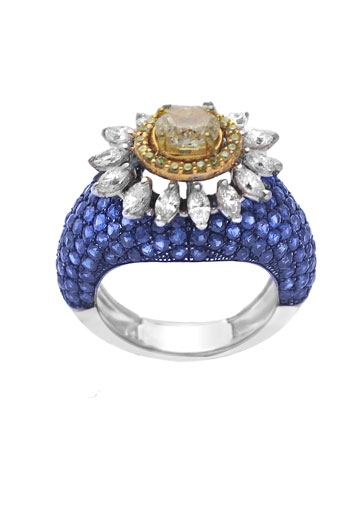 Ring by Anmol crafted in 18 k gold and set with blue sapphires, yellow diamonds, and marquise cut diamonds (Meraki Collection)