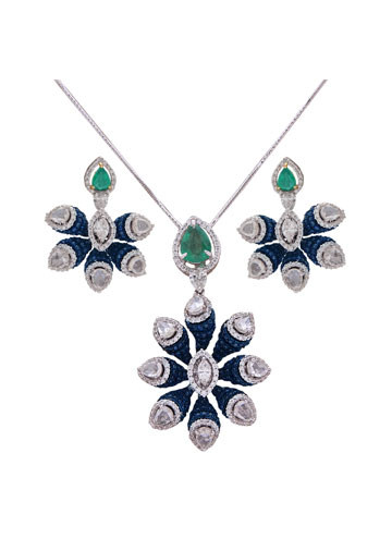 Pendant set collection by Anmol crafted in 18 k gold and set with blue sapphires, emeralds, rosecut diamonds, and round brilliant diamonds (Wisteria Collection)