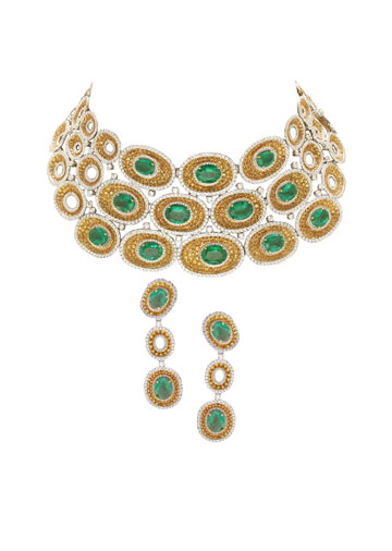 Necklace set crafted in 18 k gold with emeralds, diamonds, and yellow sapphires by Anmol