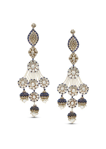 Earrings by Anmol crafted in 18 k gold and set with blue sapphires, pearls, and uncut diamonds