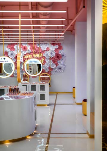 In a time when brands are cutting back on physical retail, MyGlamm is launching India’s largest beauty destination, opening at six times the average size of other beauty stores in India, and located in Mumbai’s Juhu neighborhood, home to India’s notable Bollywood stars. The space is designed as a contrarian view and redefinition of physical retail in a post-Covid world, bringing several first of its kind elements that are socially distant, privately experiential & digitally communal, redefining new world policies and physical retail. The store features many exciting spaces: