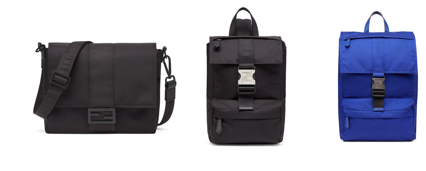 Functionality and versatility are key: every bag is designed to ensure maximum comfort whilst fitting every style. The result is a range of extremely lightweight and practical bags that will accompany the dynamic Fendi man in the great outdoors and in the everyday city: from the Baguette Messenger to the new Fendiness backpack, a casual and playful shape available in three sizes, large, small and mini with one-shoulder strap.