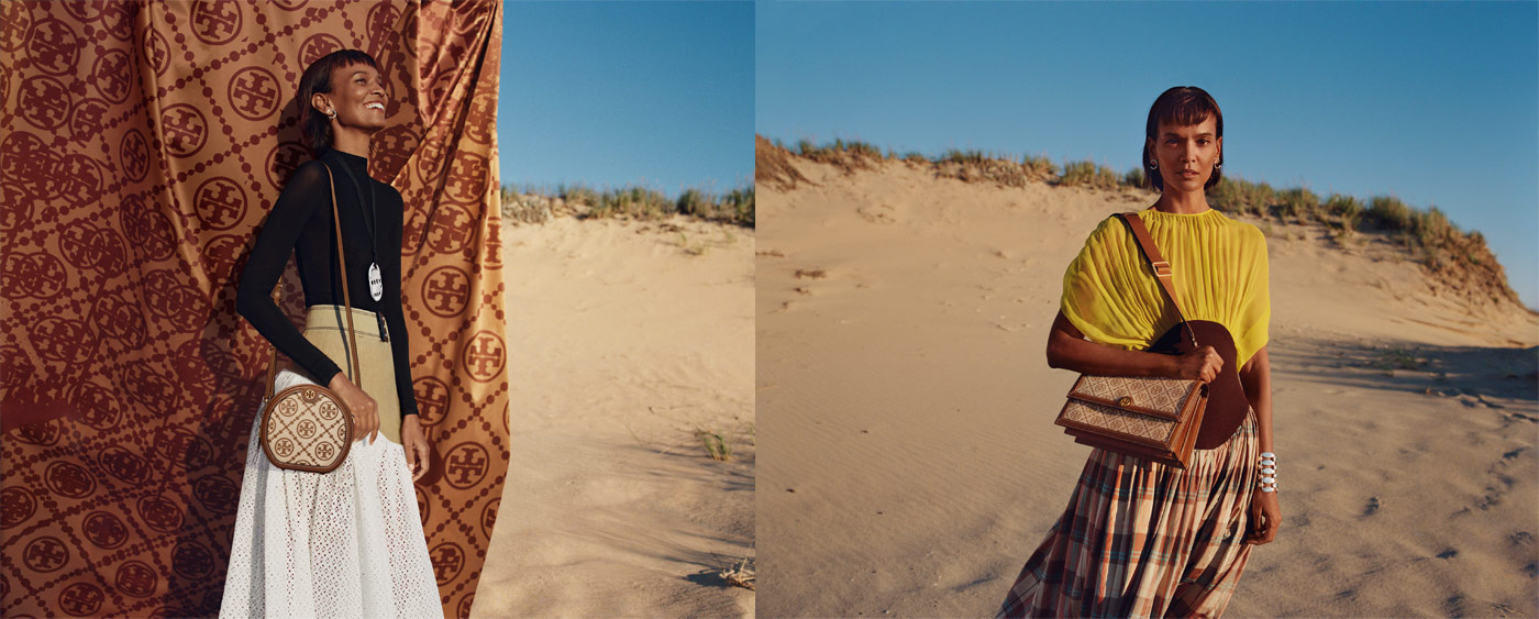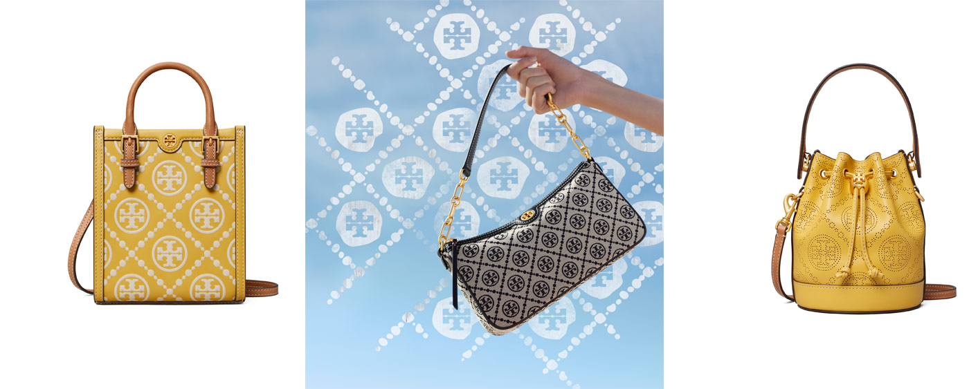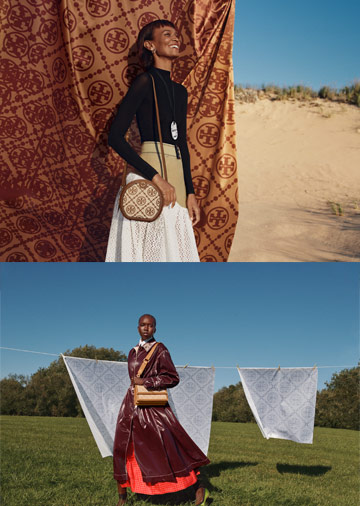 The T Monogram honours Tory Burch’s distinctive logo and history. When Tory launched the brand, she created a logo that was a design element: A classic serif T and its mirror image encased in a circle, inspired by thegeometry of Moroccan architecture and interiors by David Hicks. Using digitaI collage and bold colours, the graphic T Monogram campaign reflects the artisanal allure and timelessness of the brand’s logo.