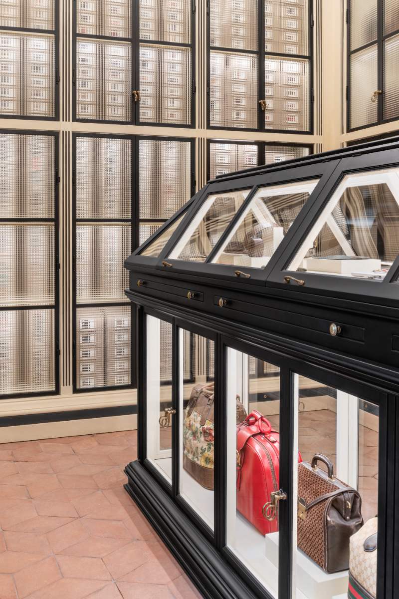 Gucci's vintage handbags encased in glass and iron cases. Photo by Valentina Sommariva