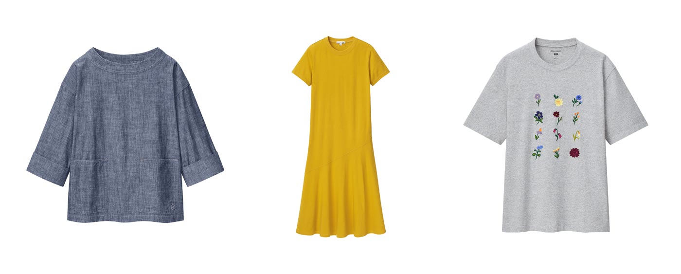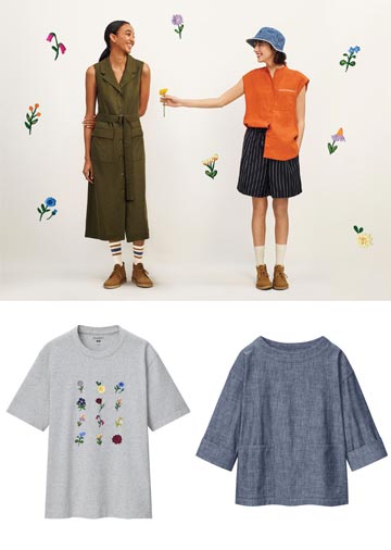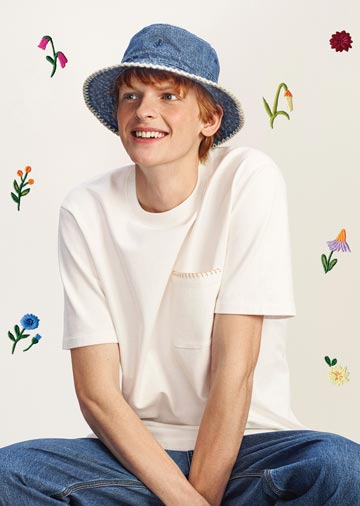 A playful sense of ease threads through the range. T-shirts, blouses, hats, tote bags, and other items feature wildflower embroidery accents with appearances that vary according to hue and fabric. Other noteworthy touches are blanket stitching on men's T-shirts and work shirts and on women's denim items, as well as bohemian smocking on dresses and skirts.