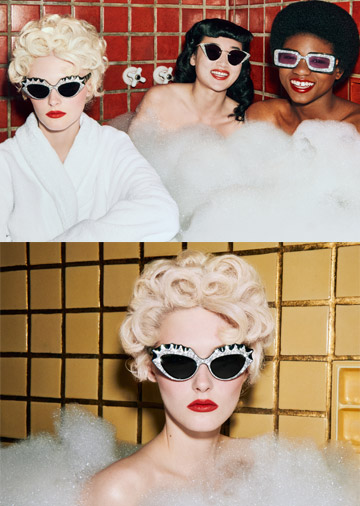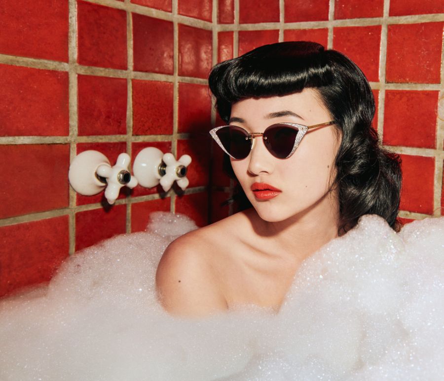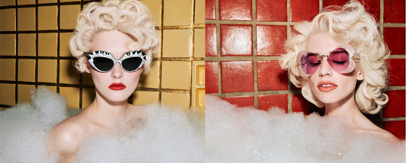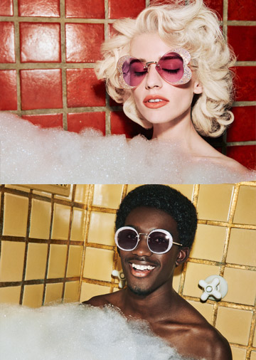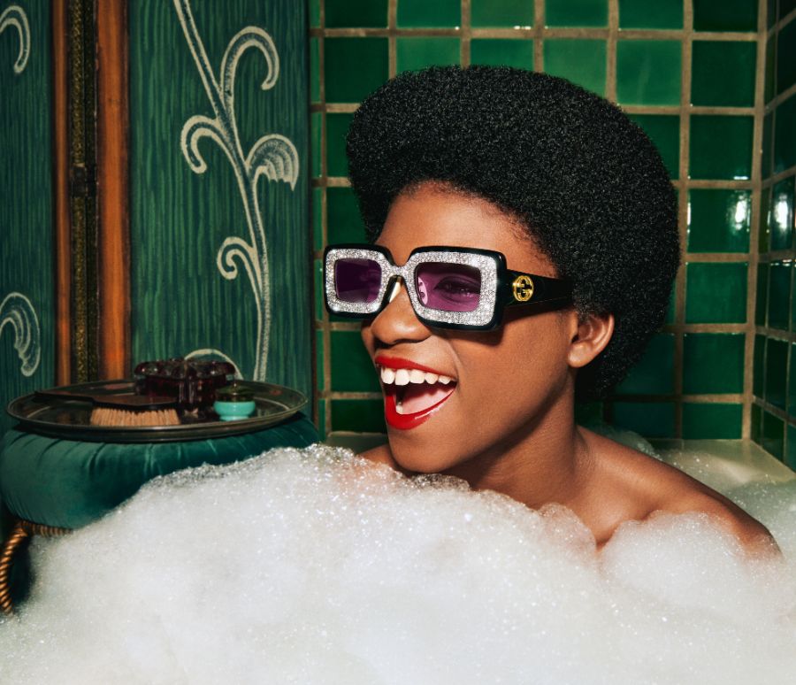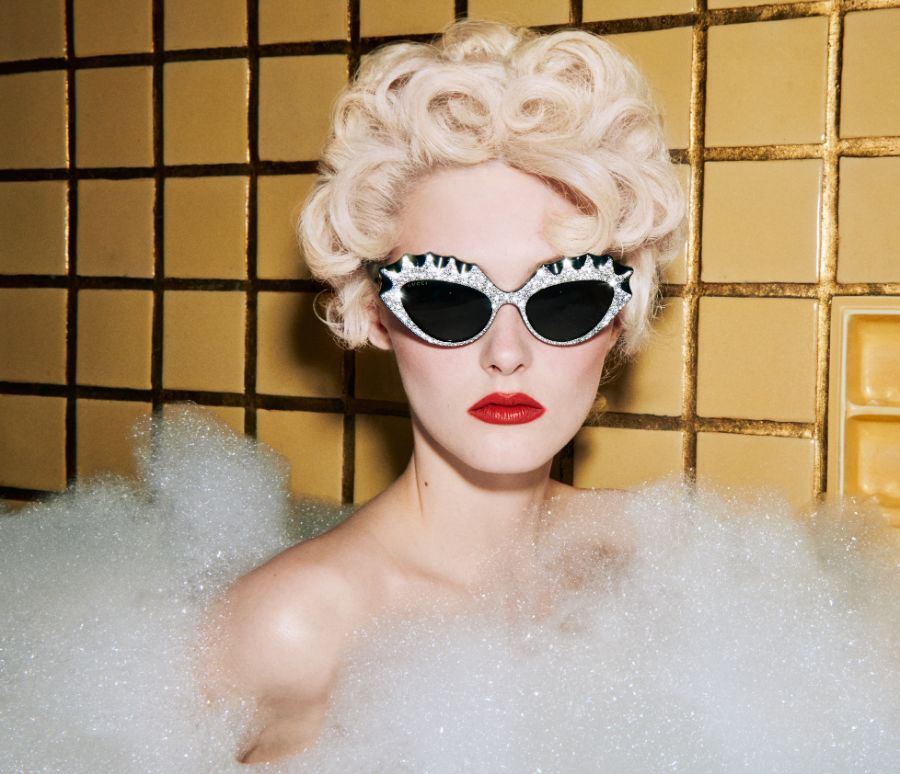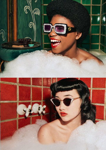 The imagery for the campaign sees our ‘actors’ in colourful tiled bathrooms taking extravagant bubble baths, wearing their Gucci sunglasses. Shot by cult artist, photographer and director Harmony Korine, the mood of the stills and video is playful and fun, the luxurious bubbles and bright tiled walls framing these glamourous and lively vignettes. Perfectly representing Gucci’s vision of creativity and self-expression, the campaign images encourage an attitude of proud freedom: the focus is on personality and character, as is also suggested by the design of the sunglasses.