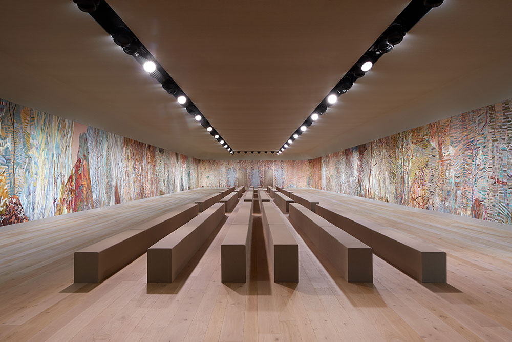 The set of the Dior Couture AW21, with murals hand-embroidered by the Chanakya School of Craft in collaboration with artist Eva Jospin. Photograph ©Adrien Dirand & Chanakya School of Craft
