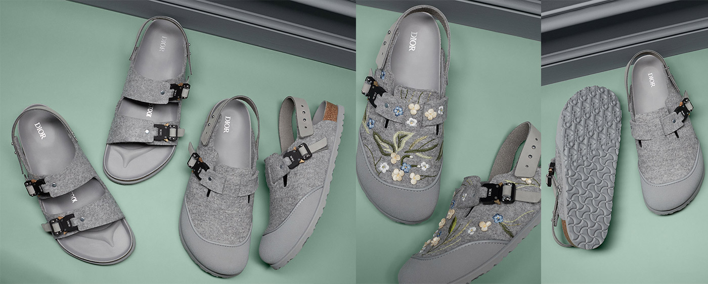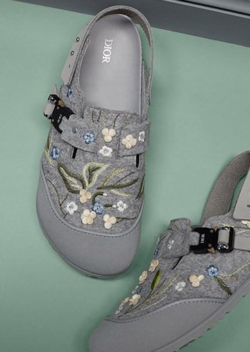 It’s the perfect marriage of French refinement and German technology. For the Dior Men’s Winter 2022-2023 collection designed by Kim Jones, Dior teamed up with Birkenstock for the first time, unveiling two reinvented iconic models. The Birkenstock Tokio mules and Milano sandals with their anatomically-shaped cork latex footbed are respectively dressed in felt and suede, tinted with the colours of the season and the ever-present Dior Gray. As a tribute to Monsieur Dior’s passion for the art of gardening, they have a functional style thanks to rubber details and industrial buckles, the emblematic feature of the Saddlebag. The result of a unique creative dialogue, the soles of these objects of desire combine the Dior Oblique motif with the German brand’s signature Bone pattern.