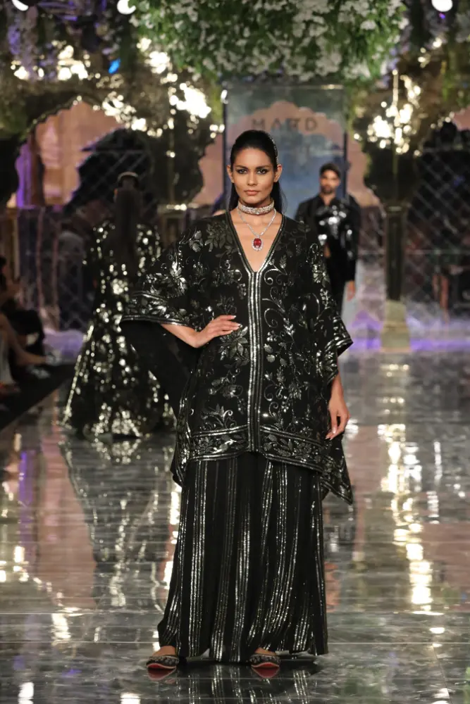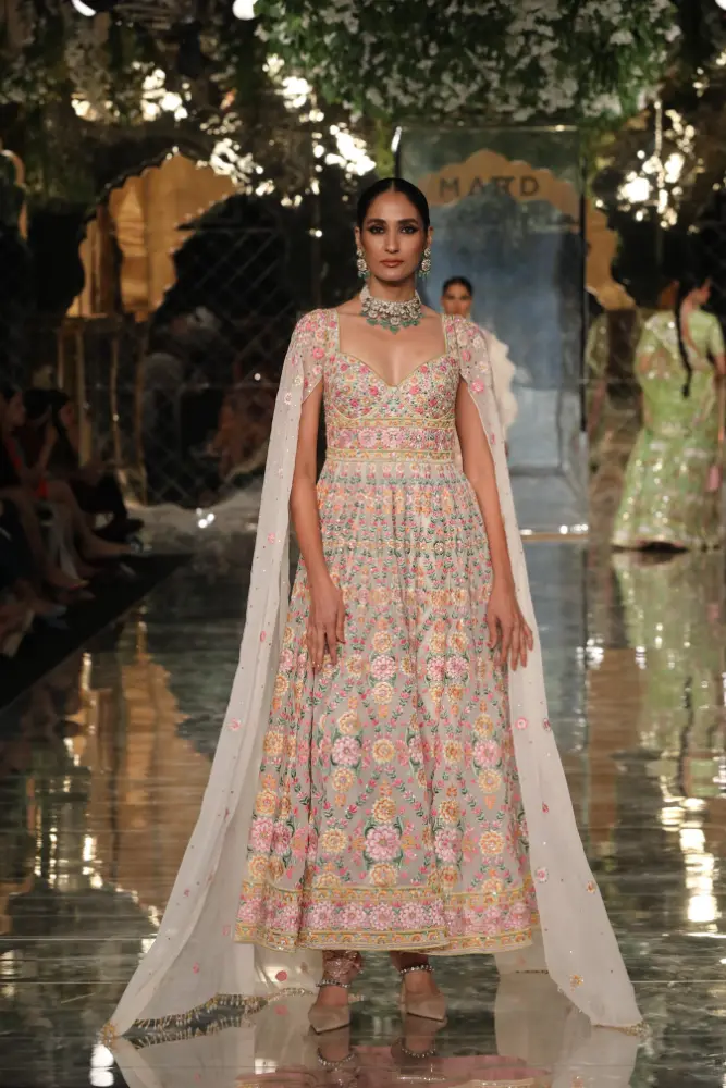 Abu Sandeep are known for their extraordinary taste, and a sense of the unpredictable. With ‘Disco Mujra’ as the music genre, they presented their art amidst a massive Haveli-inspired backdrop (decor from Abhinav Bhagat Events) infused with a folly for modern flair. Stand-up comedian Sumukhi Suresh introduced the show with her quintessential humour and an original soundtrack with musician duo Akshay and IP became the perfect music for the show. The featured songs are “Ghana Chowdhary”, “Sharam Da Chola”, “Haari Re”, “Cake” and “Snow”. GK Chudiwala’s intricate fine jewellery complemented the garments.