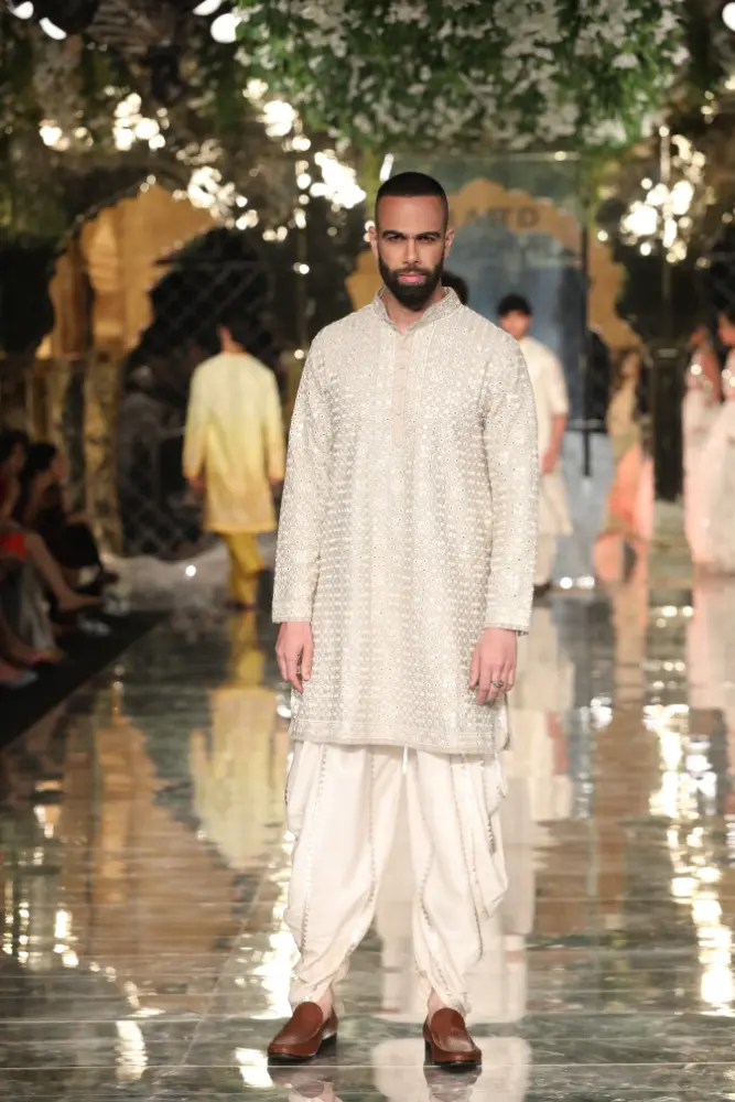 As for the details, embroideries reign supreme, with Resham threads weaving intricate patterns in a kaleidoscope of colors, while mirrors add glamour and radiance to ensembles. Classics are reinvented – front open jackets with embroideries and sherwanis boasting dramatic borders. The linings are a playground of complexity, featuring intricate prints and finishes that elevate each garment to new heights.