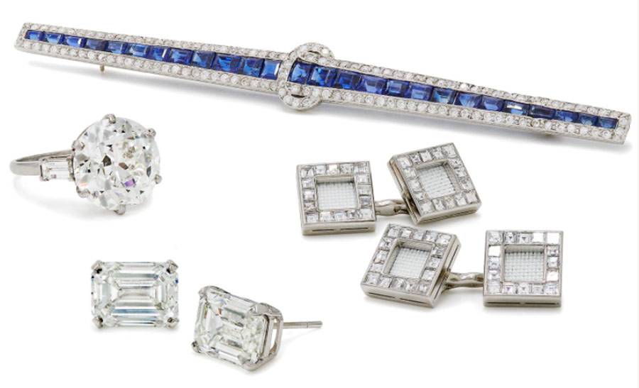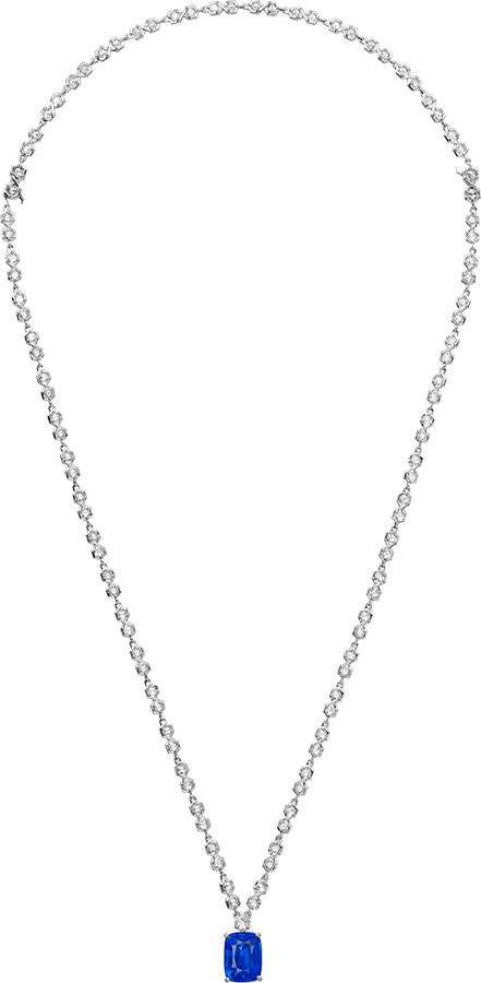 Austin Butler wore jewellery by Cartier set in platinum: a Cartier High Jewellery necklace with sapphire (shown here), a vintage Cartier Cliquet pin (New York 1928) with diamonds.