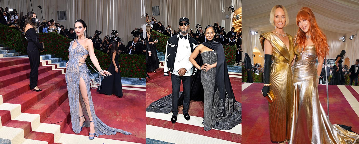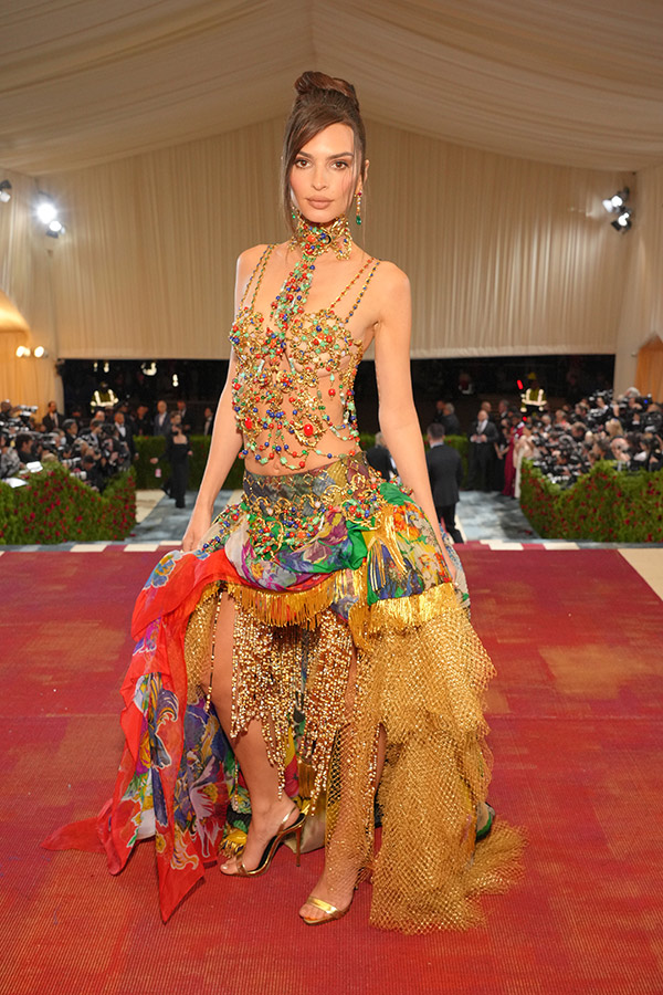 Emily Ratajkowski attended the Met Gala 2022 in an archival Atelier Versace dress from the Spring-Summer 1992 collection. A metal bustier is enriched by Baroque leaves and multicoloured resin stone details. The floral and geometric printed skirt is crafted from georgette with golden tulle and beaded fringes.