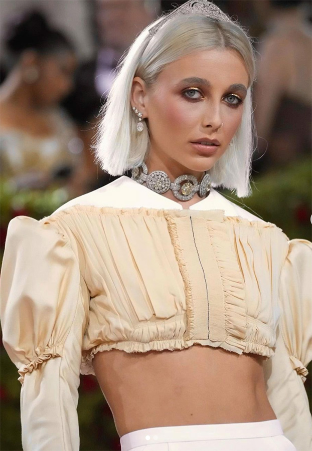 Emma Chamberlain wore jewellery by Cartier set in platinum – the most outstanding piece being a vintage Cartier diamond necklace made in Paris in 1928, which was once part of the most exquisite diamond necklace made by Cartier for the Maharaja of Patiala, a vintage Cartier diamond tiara (Paris 1911), Cartier High Jewelry earrings with diamonds, Cartier 1895 earrings with diamonds, Étincelle de Cartier wedding band with diamonds, set in platinum.