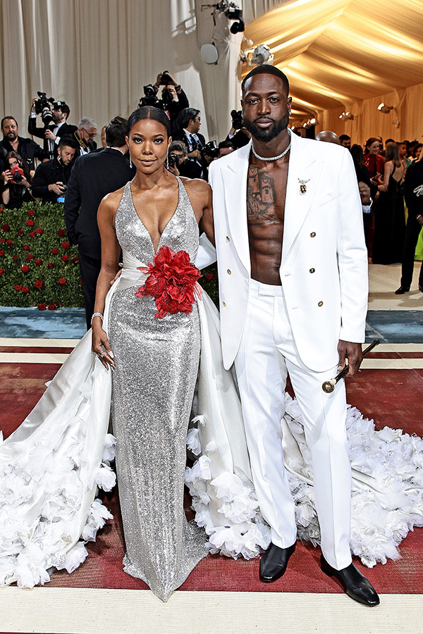 Dwyane Wade wore a custom Atelier Versace suit to the Met Gala. A contemporary reimagining of Gilded Age elegance, the slightly oversized jacket and matching tailored pants are crafted from white heavy satin, and is worn shirtless. The number 75 is embroidered to the sleeve in celebration of Wade's selection to the NBA 75th anniversary team.