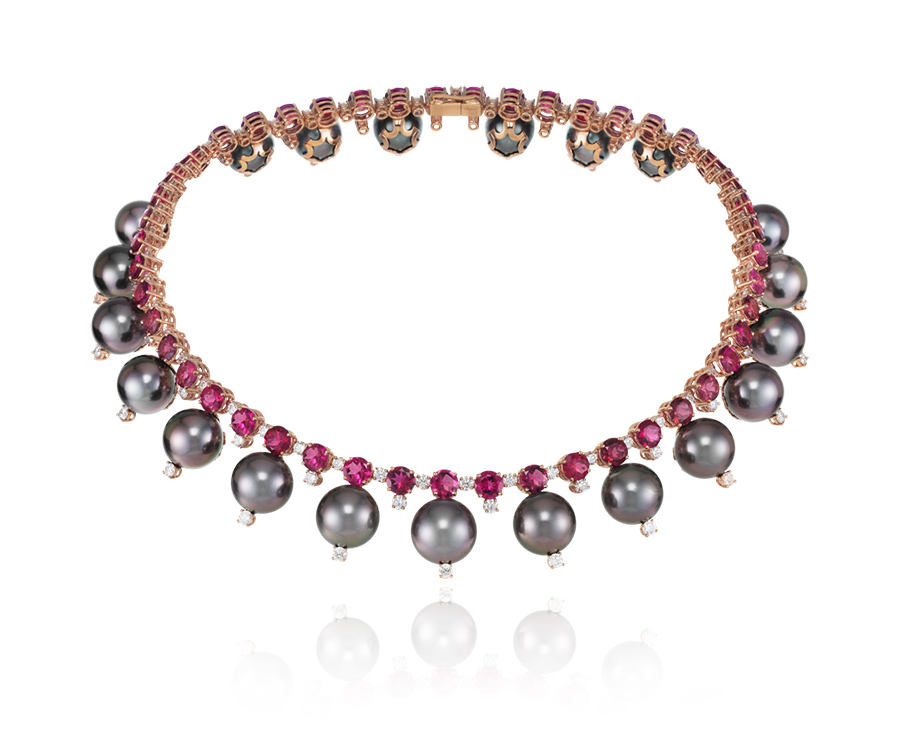 Mode Gigi Hadid shined in a necklace from the Haute Joaillerie Collection featuring 326.34 carats of black cultured pearls, 33.86 carats of rubellite tourmalines and 9.93 carats of diamonds set in 18 k rose gold and a ring from the Precious Lace Collection in 18 k rose gold featuring rubies and diamonds.