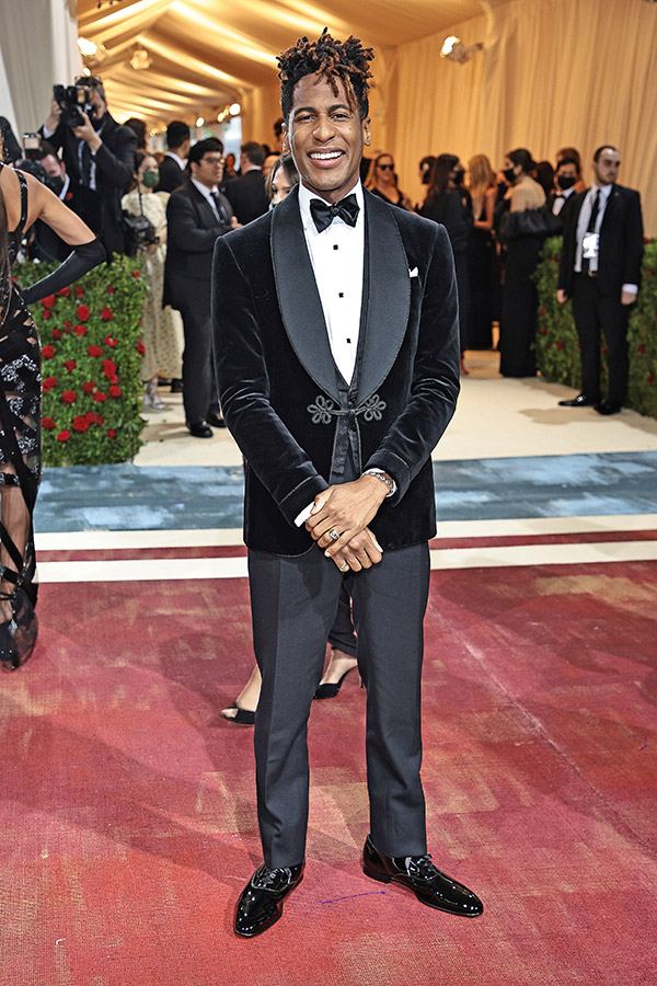 Jon Batiste wore a Ralph Lauren Purple Label Handmade Black Velvet Shawl Collar Dinner Jacket, Piqué Bib Poplin Tuxedo Shirt, Silk Jacquard Vest, Black Wool Tuxedo Trouser, and Black Silk Satin Bow Tie.