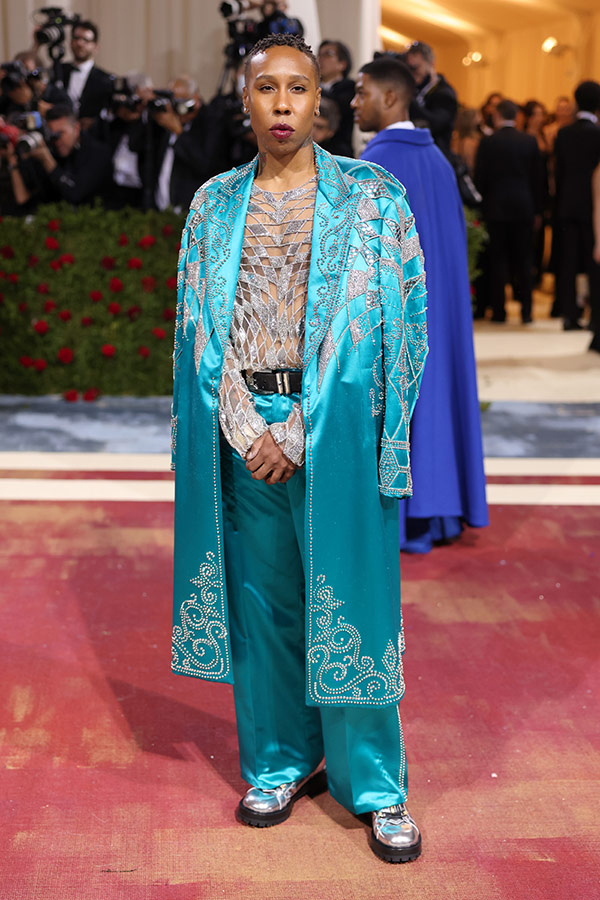 Lena Waithe wore a custom Atelier Versace ensemble inspired by American Southwestern flair and turn-of-the-century men's tailoring to this year's Met Gala. A long jacket with open back and narrow lapels in reference to the style of late-1800s America, and a pair of wide-leg palazzo pants, are crafted from turquoise duchesse, with the coat featuring hand-embroidered stud and crystal details in reference to the glitz of the Gilded Age. The look is completed with an embroidered tulle long-sleeve t-shirt with a see-through effect finishing.