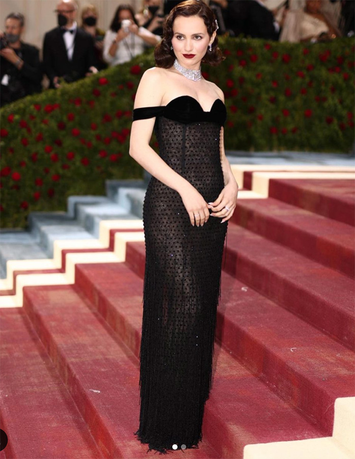 Lily James wore a custom Atelier Versace dress that captured the unabashed glamour, excess, and aspirational elegance of the Gilded Age to the annual Met Gala. A nude tulle illusion dress is covered entirely in strings of pearls in reference to their representation of royalty, decadence, and the gaining of new feminine freedoms during the Gilded Age. Each pearl is hand-embroidered and modernized in a metallic dusty blue coating. The design features asymmetric lines, a common design feature of the era, an open back with further pearl embellishments, and a keyhole cut-out neckline.