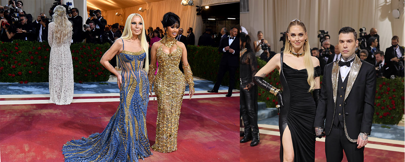Chiara Ferragni attended the Met Gala 2022 in an archival Atelier Versace dress. The long evening dress was debuted on the Atelier Versace Fall-Winter 1997 runway. It is crafted from soft leather and silk jersey draped from the right-hand side towards the back.