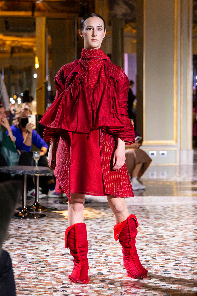 The collection of around 40 garments featured not only embroideries but full-fledged haute couture design and fabrics in a fresh prêt avatar, that shone the spotlight on hand-woven Indian textiles. Vaishali has used blockchain technology for this collection, which will guarantee the technical traceability of garments’ history, thereby ensuring not only that sustainability is the focus throughout all processes, but also guaranteeing that clients can trace the journey of the hair fibres of the goat – in case of pashmina – to the final garment, with a quick scan of a QR code.