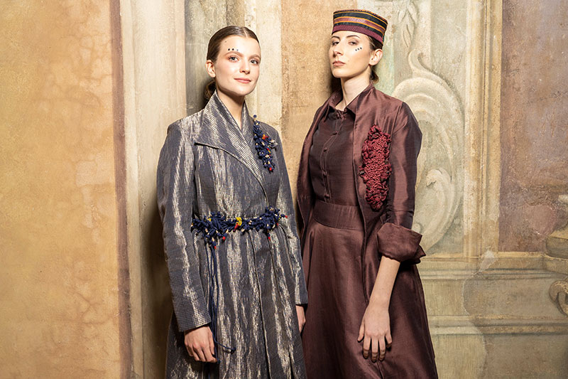 Srauta is an autumn winter collection, thus it needs a warmer blend on the loom. At the same time, I need light and moldable materials for my silhouettes. Therefore, I have created two blends with Merino wool and with pashmina. We have had to work carefully in calibrating the handlooms in different ways, but the result is quite exciting, with weaves that are unique, light, and warm at the same time.