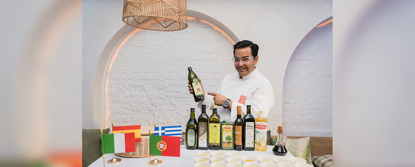 Chef Ajay Chopra begins the workshop with a presentation on Olive Oil - types, benefits, exports to India, uses in Indian cooking