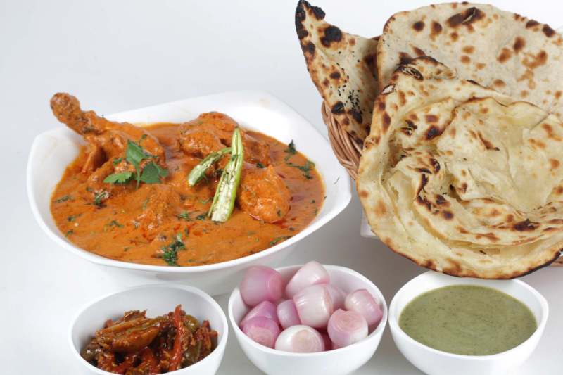 Moti Mahal Delux's Butter Chicken with Naan and relishes