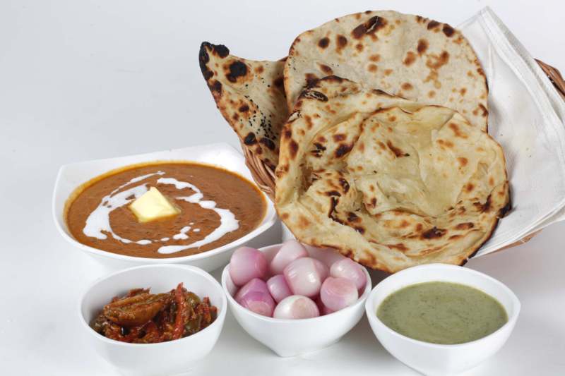 Moti Mahal Delux's Dal Makhni, Naan, and accompanying relishes