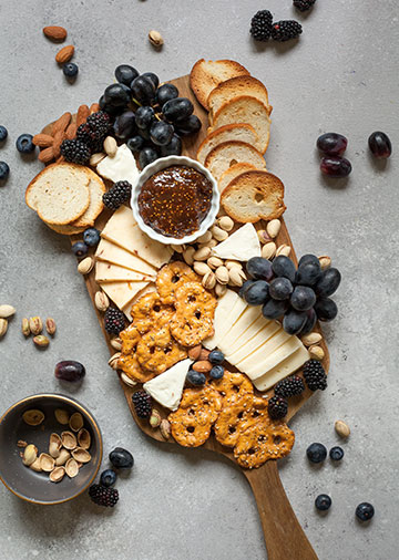 Cheese board with pairings of fruit, bread, nuts and pretzels. Lindsay Moe. Unsplash