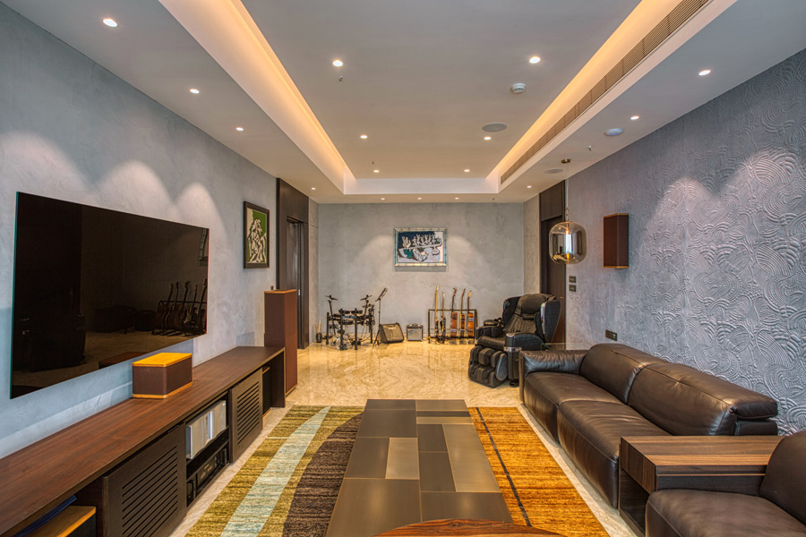 For a family bustling with talent, a corner of the home is dedicated to celebrating the arts. A wall with a collection of musical instruments is set up to look like a stage, forming the backdrop of the den. It has a soft blue textured wallpaper that sets the mood, all the while balancing the room's acoustics in case of an impromptu performance. (Asian Paints colours adorn the walls.)
