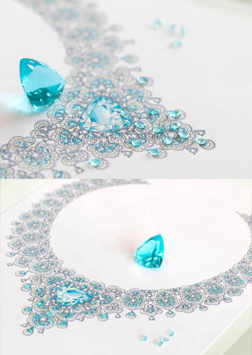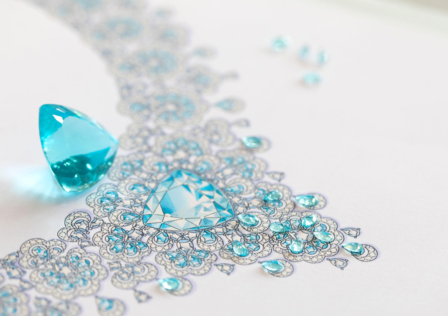 The Chopard Precious Lace Necklace sketch, with the Paraiba tourmaline