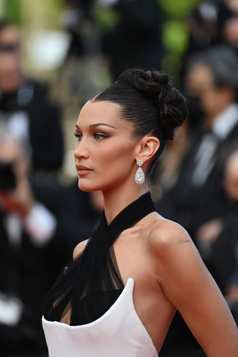 American Model Bella Hadid shone in pair of earrings in 18 k white Fairmined-certified gold from the Red Carpet Collection featuring a pair of pear-shaped diamonds totaling 18.05-carats and 5.82-carats of diamonds, along with a ring in 18 k white Fairmined-certified gold featuring a 5.45-carat marquise-cut diamond and 2.11-carats of diamonds and a ring in 18 k white Fairmined-certified gold featuring a 2.42-carat heart-shaped ruby and 1.64-carats of diamonds, both from the Haute Joaillerie Collection.