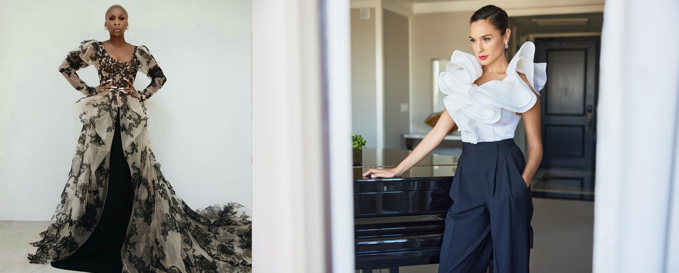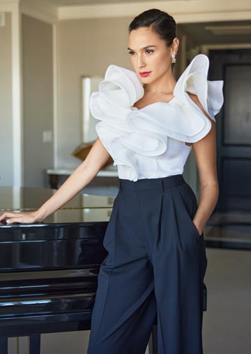 Gal Gadot wears Tiffany & Co. earrings and a Prabal Gurung ruffled top and pants combo