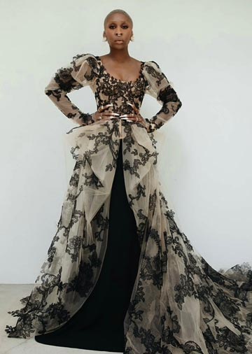 Cynthia Erivo wears Tiffany & Co. earrings and rings, and a Vera Wang gown